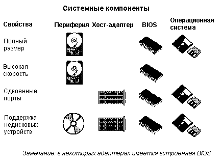 Рисунок 4. Компоненты технологии EIDE. Как показано на рисунке 4, технология Enhanced IDE включает в себя четыре основных компоненты, реализуемые совместно в периферийных устройствах, контроллерах EIDE, BIOS и операционной системе: 1. Использование винчестеров размером более 528Мб. Винчестер должен поддерживать спецификацию ATA (этому требованию удовлетворяет большинство современных винчестеров). BIOS также должна поддерживать спецификацию ATA; большинство производителей системных плат и разработчиков BIOS уже поддерживают этот режим. Может потребоваться поддержка работы с большими дисками и со стороны операционной системы. Windows 3.1 не полностью соответствует ATA, поэтому приходится использовать специальные драйверы (Windows "32-bit disk access"), обычно поставляемые вместе с контроллерами EIDE. Большинство 32-разрядных операционных систем (таких, как OS/2) изначально поддерживают работу с большими дисками. 2. Ускоренный обмен данными основан на использовании скоростных режимов программируемого ввода-вывода (PIO mode 3) и прямого доступа к памяти (DMA mode 1). Эти режимы обеспечивают скорость обмена 11.1 и 13.3 Мб/сек, соответственно. Для реализации скоростного обмена требуется поддержка со стороны винчестера и BIOS. BIOS должна поддерживать один из скоростных режимов обмена с диском (PIO mode 3 или DMA mode 1), как правило это режим PIO. Со стороны дискового устройства также должна обеспечиваться поддержка скоростного обмена. Эту возможность обеспечивает большинство современных винчестеров (в том числе диски Fast ATA). Скоростные режимы обмена позволяют полнее реализовать возможности дисковых контроллеров, использующих широкополосную локальную шину VESA или PCI. 3. Поддержка двух портов ATA. Для обеспечения этой возможности используются зарезервированные для второго контроллера адреса портов ввода-вывода и прерывание IRQ15. Для реализации этой возможности требуется поддержка со стороны контроллера (хост-адаптера), BIOS и операционной системы. К самим устройствам (винчестерам, приводам CD-ROM или стриммерам) не предъявляется никаких дополнительных требований. Контроллер должен обеспечивать возможность установки адресов второго порта (это реализовано отнюдь не во всех современных моделях). Не все BIOS поддерживают возможность использования четырех устройств IDE, однако современные разработки включают этот режим. Важную роль играет поддержка использования четырех устройств со стороны операционной системы. Эта возможность реализована в большинстве 32-разрядных ОС и в последних версиях DOS. 4. Возможность подключения приводов CD-ROM и стриммеров. Этот режим является недорогой альтернативой SCSI. Для обеспечения такой возможности требуется требуется поддержка нескольких новых команд. Спецификация ATAPI (ATA Packet Interface), находящаяся в стадии разработки, содержит описание новых команд. Для обеспечения возможности подключения к хост-адаптеру недисковых устройств требуется поддержка спецификации ATAPI со стороны BIOS, хост-адаптера, операционной системы и самих периферийных устройств. В настоящее время большинство устройств CD-ROM уже использует интерфейс IDE/ATAPI для подключения ко второму порту современных контроллеров. Очевидно, что при таком обилии вариантов расширения возможностей IDE отнюдь не все устройства, рекламируемые как "Enhanced", поддерживают все четыре режима, добавленные в спецификацию Enhanced IDE. Не след
