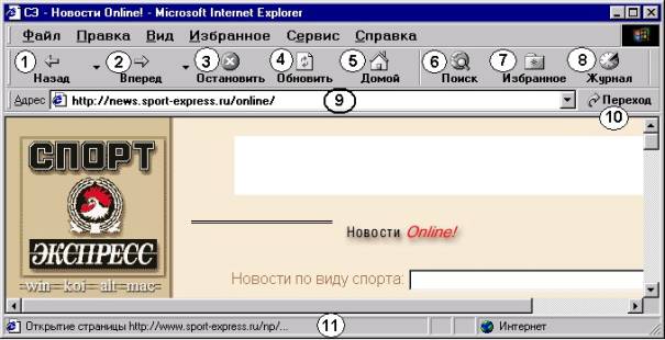 Окно Internet Explorer Кроме того, у кнопки обновления есть еще одна функция, связанная с использованием дисковой кэш-памяти. Дело в том, что переданные из Интернета страницы хранятся на жестком диске компьютера в виде временных файлов. Когда мы нажимаем кнопки Вперед или Назад, то броузер может загрузить страницу с сервера или же восстановить из временного файла с диска. Как правило, «по умолчанию» броузер грузит страницу с жесткого диска (можно выбрать нужный режим с помощью параметров из окна Свойства Обозревателя, вызываемого из меню Вид). 5 - кнопка Домой. Эта кнопка нужна, чтобы перейти к домашней странице (первой странице, которая выводится на экран при запуске обозревателя). Ее настраивают на Web-страницу, с которой пользователь чаще всего начинает работу в Интернете. 6 - кнопка Поиск. Эта кнопка служит для открытия панели поиска и выбора соответствующей службы для поиска в Интернете. 7 - кнопка Избранное. Эта кнопка нужна, чтобы открыть панель избранного, на которой можно хранить ссылки на наиболее часто посещаемые Web-страницы или документы. Кнопка Журнал (8) предназначена для открытия панели, в которой находятся сгруппированные в хронологическом порядке ссылки на Web-страницы и сайты посещенные за последние несколько дней. 9 - Адресная строка. В нее вводят адреса (URL) Web-страниц или пути к документам, хранимым на компьютере. 10 – кнопка Переход, предназначена для перехода к Web-странице по адресу, введенному в адресную строку. 11 - Строка состояния. В левой части строки находится индикатор процесса загрузки Web-страниц. В правой части содержится информация о том, к какой зоне безопасности относится текущая страница и виден значок замка, если данный узел является безопасным. Поиск нужной информацииДля поиска информации в Web, можно использовать различные способы: - с помощью щелчка на кнопке Поиск панели инструментов можно получить доступ к ряду поисковых служб. Ввести слово или фразу в поле Поиск; - нужно ввести go, find или ? за словом или фразой в панели адрес; - после открытия Web – страницы можно искать специфический текст в ней, используя меню Правка Найти на этой странице. Быстрое открытие любимых страниц (папка Избранное)Если найдены Web-узлы, которые нам нравятся, то с помощью IE можно их запомнить для дальнейшего быстрого доступа: - добавлением Web-узла в избранное; - добавлением в панель ссылок; - если имеется один Web-узел, который посещается больше всего, то можно его сделать домашней странице так, чтобы она отображалась каждый раз при загрузке IE или щелчке на кнопке Домой стандартной панели инструментов. Добавление к списку избранного1. Нужно перейти на страницу, которую нужно добавить к списку избранного. 2. Выбрать в меню Избранное_ Добавить в избранное. 3. Ввести новое имя страницы. Добавлять Web-узлы к панели ссылок можно несколькими способами: - перетаскивая пиктограмму Web-страницы с панели адресов на панель ссылок; - перетаскивая связь Web- страницы на панель ссылок. Изменение домашней страницы1. Нужно открыть Web-страницу, которую нужно сделать домашней. 2. Выбрать в меню Сервис_ Свойства обозревателя. 3. В группе Домашняя страница щелкнуть на кнопку с текущей. Поиск недавно посещаемых избранных мест.1. На стандартной панели инструментов щелкнуть на кнопку Журнал. Появится панель, содержащая Web-узлы, посещенные в предыдущие дни и недели. 2. В списке Ж