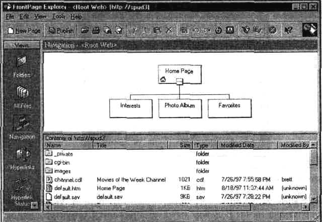 Окно проводника FrontPage Дополнительные элементы форматирования, не вынесенные на панель инструментов, задаются в отдельных диалоговых окнах. Их можно открыть, например, с помощью команд Формат > Шрифт и Формат > Список. Для создания гиперссылки надо выделить фрагмент текста, который будет использоваться как ссылка, и дать команду Вставка > Гиперссылка. В открывшемся диалоговом окне "Создать гиперссылку" выбирают вкладку WWW для создания внешней ссылки, вкладку Открыть страницы для создания ссылки на другую страницу своего узла (используется относительный адрес) и вкладку Новая страница для одновременного создания ссылки и соответствующего документа, который немедленно открывается для редактирования. Поле Кадр назначения служит для указания имени фрейма, в котором будет открываться страница, а поле Закладка — для указания якоря, который при этом используется. Созданная гиперссылка отображается в окне программы FrontPage так же, как и в окне броузера: синим цветом и с подчеркиванием. Чтобы проверить работоспособность ссылки, следует щелкнуть на ней правой кнопкой мыши и выбрать в контекстном меню команду Перейти по ссылке.