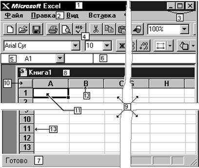 1. Поле названия главного окна. 2. Строка меню. 3. Кнопки управления 4. Панели инструментов. 5. Поле имени. 6. Строка формулы. 7. Строка состояния 8. Поле названия окна рабочей книги (дочернее окно Excel). 9. Активный лист рабочей книги. 10.Кнопка выделения всего листа. 11.Активная (текущая) ячейка. 12.Имя столбца. 13.Имя строки. Рис. 2. Элементы рабочего листа В окне Excel, как и в других программах Windows, под заголовком окна находится строка меню. Она содержит главное меню Excel. Посредством команд из этого меню можно выполнить все возможные действия над рабочими книгами и данными в таблицах. 2.2.2. Строка состоянияПолоса внизу экрана, на которой выводится информация о выбранной команде или выполняемой операции. Выделенная команда коротко описывается в левой части строки состояния. Здесь также указывается информация о выполняемой операции, такой, как открытие или сохранение файла, копирование ячеек или запись макроса. Правая часть строки состояния показывает, включены ли ключи, такие, как CAPS LOCK, SCROLL LOCK или NUM LOCK. 2.2.3. Основные правилаПосле запуска Excel на экране появляется рабочая книга Книга1, содержащая 16 рабочих листов. Каждый лист представляет собой таблицу, состоящую из строк и столбцов. На основном экране расположены следующие объекты: строка основного меню, две панели инструментов Стандартная и Форматирование, строка формул, поле имени, строка состояния, полосы прокрутки. Взаимодействие с Excel осуществляется посредством выбора команд из основного меню. Все команды являются иерархическими. В результате выбора одной из таких команд на экране появляется ее ниспадающее меню. Для выполнения команды из основного меню поместите курсор мыши на требуемую команду и нажмите кнопку мыши. Для отказа от выбора опции ниспадающего меню после его появления на экране нажмите клавишу Esc и вы попадете в меню предыдущего уровня. Для получения справочной информации нажмите мышью знак ? из основного меню. Появится меню, в котором выберите команду Вызов справки. Также, окно диалога многих команд содержит кнопку Справка, при нажатии которой Excel обеспечит вас информацией о том, как пользоваться этим окном диалога. Кнопка Справка, расположенная на панели инструментов Стандартная, добавляет к курсору мыши вопросительный знак ?. После этого информацию о командах и элементах экрана можно получить, если установить в нужное место указатель мыши с вопросительным знаком и нажать левую кнопку мыши. После завершения текущего сеанса работы в Excel выполните команду Файл | Выход. 2.2.4. ЯчейкаЯчейка - это основной элемент электронной таблицы только в ней может содержаться какая-либо информация (текст, значения, формулы ) Структура ячейки Excel: