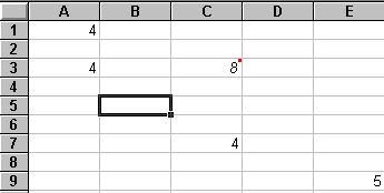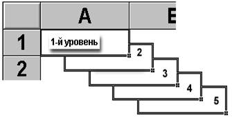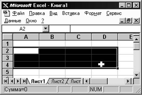 Рис. 3. Уровни ячейки 1-й уровень содержит видимое на экране изображение (т.е. отформатированный текст) или результат вычисления формулы). 2-й уровень содержит форматы ячейки (формат чисел, шрифты, выключатель (включатель) признак показывать или нет ячейку, вид рамки, защита ячейки). 3-й уровень содержит формулу, которая может состоять из текста, числа или встроенных функций. 4-й уровень содержит имя ячейки, это имя может использоваться в формулах других ячеек, при этом обеспечивается абсолютная адресация данной ячейки. 5-й уровень содержит примечания данной ячейки (произвольный текст). Если ячейка содержит примечание, то в правом верхнем углу появляется красный квадратик (точка) Блоки ячеекДля работы с несколькими ячейками сразу необходимо выделить блок ячеек. Это выполняется следующим образом: Щелкнув на ячейке и удерживая кнопку мыши, протяните по листу указателем. При этом будет произведено выделение смежных ячеек. Блок описывается двумя адресами, разделенными знаком двоеточия - адресом верхней-левой и нижней-правой ячеек. На рисунке, например, выделен блок: A2:D4.