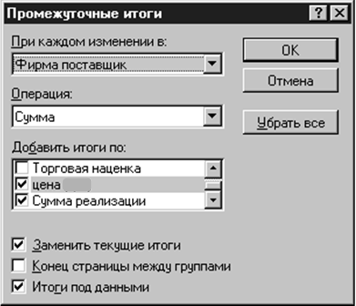 Ссылка - это интервал или ссылка, для которой подводятся итоги. Если список с промежуточными итогами уже создан, его можно модифицировать, редактируя формулу с функцией ПРОМЕЖУТОЧНЫЕ. ИТОГИ. 5.6.1. Вставка промежуточных итоговДля каждого товара можно ввести в таблицу промежуточные итоги - суммы по полям: Количество, Сумма закупки, Сумма реализации, Прибыль и среднее значение поля Закупочная цена (руб). Сначала заполняются поля, содержащие исходные данные: “Наименование”, “Фирма-поставщик”, “цена (руб)” и “количество”. Вычисляемые поля таблицы заполняются формулами. Для создания формулы в поле “цена ($)” и пользуется имя, присвоенное ячейке, содержащей числовое значение текущего курса валюты. Для создания формул в поле “Сумма реализации” и пользуется частичный запрет модификации адреса ячеек (с помощью значка $ перед номером строки), содержащих розничную цену для каждого из товаров. Промежуточные итоги заполняются через меню Данные | Итоги... | Промежуточные итоги: