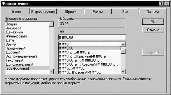 2.6. Формат данныхДанные в Excel выводятся на экран в определенном формате. По умолчанию информация выводиться в формате Общий. Можно изменить формат представления информации в выделенных ячейках. Для этого выполните команду Формат | Ячейки. Появится окно диалога Формат ячеек, в котором нужно выбрать вкладку Число. В левой части окна диалога Формат ячеек в списке Числовые форматы приведены названия всех используемых в Excel форматов (см. Рис.). Для формата каждой категории приводится список его кодов. На рисунке из списка Числовые форматы выбрана строка (все форматы). В правом окне Тип вы можете просмотреть все форматные коды, которые используются для представления на экране информации. Для представления данных вы можете использовать встроенные форматные коды Excel или ввести свой (пользовательский) код формата. Для ввода форматного кода выберите строку (все форматы) и введите символы форматного кода в поле ввода Тип. Любая последовательность введенных в ячейку символов, которая не может быть интерпретирована Excel как число, формула, дата, время дня, логическое значение или значение ошибки, интерпретируется как текст. Введенный текст выравнивается в ячейке по левому краю.