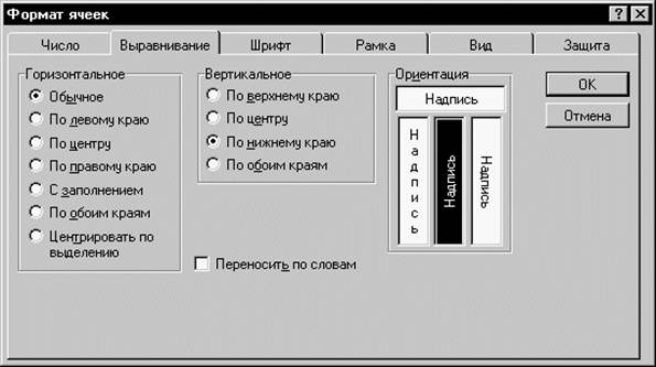 Рис. 14. Формат числа Чтобы ввести текст, выделите ячейку и наберите текст с клавиатуры. Ячейка может вмещать до 255 символов. Можно форматировать отдельные символы или фрагменты текста в ячейке и вводить текст в формулах, диаграммах, текстовых окнах. Для форматирования расположения текста в ячейке используется закладка Выравнивание в диалоговом окне Формат ячеек. Здесь Вы можете расположить текст для чтения снизу-вверх, сверху-вниз, выровнять по правому, левому, нижнему или верхнему краю ячейки, можно переносить слова текста в пределах ячейки. С помощью остальных закладок Вы можете отформатировать шрифт, параметры рамки вокруг ячейки, способы заливки ячейки различным цветом, включить или снять защиту с ячейки.