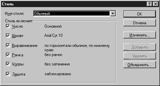Рис. 16. Стиль оформления В понятие стиля входят формат представления чисел, тип и размер шрифта, тип выравнивания, вид рамки, наличие узора и защиты. Можно применить определенный стиль, как к выделенной области ячеек, так и к любому рабочему листу рабочей книги. Для создания стиля используется команда Формат | Стиль. Выполнение этой команды открывает окно диалога Стиль. Стили можно создавать по образцу, по определению, копированием из другой рабочей книги. Вы можете определить стиль ячейки, выбрав нужную комбинацию форматов и приписав ей имя. Стиль можно переопределить, изменяя в нем характеристики форматирования ячейки. В поле ввода Имя стиля выводится имя стиля, который применяется к выделенным ячейкам. В этом окне можно просмотреть существующие стили. Нажатие кнопки Изменить выводит окно диалога Формат Ячеек, в котором можно выбрать стили для применения к ячейкам. После определения стиля в окне диалога Формат Ячеек, нажмите кнопку Добавить для добавления выбранного стиля. Для копирования стилей из одной рабочей книги в другую нажмите кнопку Объединить и в окне диалога Объединить стили из выберите рабочую книгу, стили из которой вы собираетесь копировать. Кнопка Удалить удаляет стиль, выделенный в поле Имя стиля. 3. Вычисления в Excel. Формулы и функцииОсновным достоинством электронной таблицы Excel является наличие мощного аппарата формул и функций. Любая обработка данных в Excel осуществляется при помощи этого аппарата. Вы можете складывать, умножать, делить числа, извлекать квадратные корни, вычислять синусы и косинусы, логарифмы и экспоненты. Помимо чисто вычислительных действий с отдельными числами, вы можете обрабатывать отдельные строки или столбцы таблицы, а также целые блоки ячеек. В частности, находить среднее арифметическое, максимальное и минимальное значение, средне-квадратичное отклонение, наиболее вероятное значение, доверительный интервал и многое другое. 3.1. ФормулыФормулой в Excel называется последовательность символов, начинающаяся со знака равенства “=“. В эту последовательность символов могут входить постоянные значения, ссылки на ячейки, имена, функции или операторы. Результатом работы формулы является новое значение, которое выводится как результат вычисления формулы по уже имеющимся данным. Если значения в ячейках, на которые есть ссылки в формулах, меняются, то результат изменится автоматически. В качестве примера приведем формулы, вычисляющие корни квадратного трехчлена: ax2+bx+c=0. Они введены в ячейки A2 и A3 и имеют следующий вид: =(-B1+КОРЕНЬ(B1*B1-4*A1*C1))/2/A1 =(-B1-КОРЕНЬ(B1*B1-4*A1*C1))/2/A1 В ячейках A1, B1 и C1