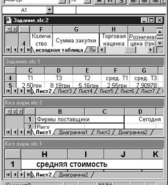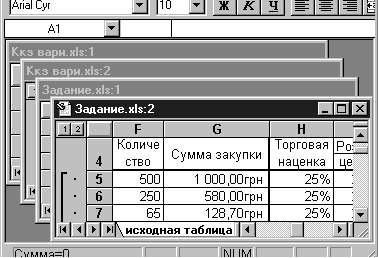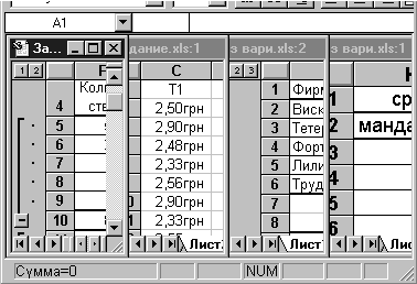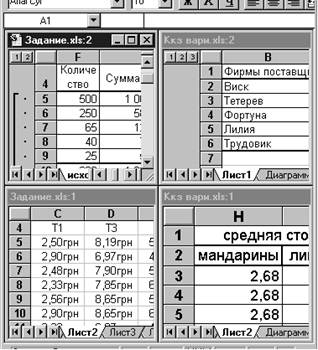 Рис. 5. Блок ячеек 2.3. Окна ExcelКоманда Новое Окно (меню Окно) создает дополнительное окно для активной рабочей книги, так что Вы можете просматривать различные части рабочей книги одновременно. Можно открыть более, чем одно новое окно для данного листа или рабочей книги; их максимальное количество ограничено только объемом доступной памяти. Строка заголовка показывает имя рабочей книги, за которым после двоеточия следует номер нового окна. Например, второе окно рабочей книги BUDGET.XLS будет названо BUDGET.XLS:2. Команда Упорядочить все (меню Окно) Отображает все открытые документы в окнах так, чтобы они не перекрывались на экране. Данный режим используется для того, чтобы отобразить окна, которые не видны, или чтобы организовать размещение окон на экране.
