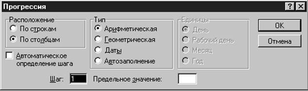 необходимо выделить нужный диапазон ячеек и нажать кнопку 4.1. СерииВ Excel разработан механизм ввода рядов данных (серий). Под сериями подразумеваются ряды данных, построенные по определенному закону. При этом данные не обязательно должны быть числовыми, они могут быть и формализованными текстовыми. Создание серий возможно несколькими способами, отдельным подразделом создания серий является Прогрессия. 4.1.1. ПрогрессияДля построения произвольных серий выполните команду Правка | Заполнить | Прогрессия. Появится окно диалога Прогрессия, в котором можно установить параметры серий.