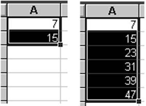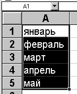 Рис. 19. Первый способ создания серий Такой простой процесс ввода возможен только тогда, когда в ячейку введен один из элементов имеющегося списка. Списки создаются в диалоговом окне Файл | Параметры на закладке Списки. Второй способМожно построить серию данных и другим способом, если указать шаг построения. Для этого нужно ввести вручную второй член будущего ряда, выделить обе ячейки и затем, воспользовавшись правым-нижним углом выделения, продолжить выделение до нужной области. Две первых ячейки, введенные вручную, задают шаг серии данных.