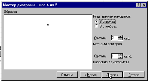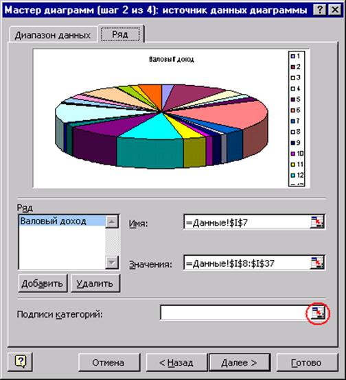 Рис. 25. Шаг 2 · На 2-м шаге мастера выбрать закладку "Ряд" и установить следующие значения в 3 полях ввода: "Имя" - адрес ячейки содержащей текст "Валовый доход" (уже должно стоять) "Значения" - адрес блока ячеек со значениями валового дохода (уже должно стоять) "Подписи категорий" - адреса ячеек таблицы с наименованиями товаров и фирм-поставщиков (это поле ввода нужно заполнить мышью, используя кнопку свертывания мастера в конце поля. По окончании заполнения, снова нажать эту кнопку для возврата к окну мастера). · На третьем шаге - выбрать закладку "Подписи данных" и установить переключатель в положение "доля"