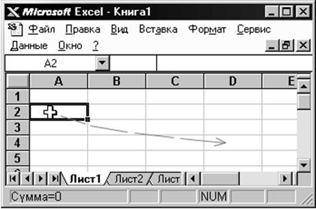 Рис. 18. Создание Прогрессии В окне можно выбрать тип прогрессии Арифметическую, Геометрическую, Даты и Автозаполнение и как она будет заполняться По строкам или По столбцам. Для создания прогрессии необходимо ввести в ячейку начальное значение, выбрать Расположение и Тип прогрессии, указать Шаг и Предельное значение и нажать OK. Ряды дат и времени дня могут использовать приращения по дням, неделям, месяцам, годам. Чтобы получить ряд дат, вы должны указать повторяемость последовательности: дни, недели, месяцы или годы. Автозаполнение. В этом режиме можно продолжать различные типы данных. Возможность Автозаполнения логически продолжает некоторые заданные последовательности, например, Кв.3, Кв.4, Кв.5. Вы можете использовать возможность Автозаполнения непосредственно с помощью перемещения курсора заполнения на рабочем листе или с помощью окна диалога Прогрессия. Отметим, что в поле ввода Предельное Значение можно ввести значение, на котором нужно закончить ряд. Если выделенная область заполняется до достижения этого значения, то построение ряда прекращается. Поле ввода Предельное Значение может оставаться пустым. Тогда заполняется вся выделенная область. Наиболее интересным параметром в окне диалога Прогрессия является флажок Автоматическое определение шага. Если он установлен, то вычисляется значение шага, опираясь на значения в верхних или левых ячейках выделения, для создания наиболее близкой к ряду прямой (для линейного тренда) или экспоненциальной линии (для экспоненциального тренда). При установке этого флажка значение из поля ввода Шаг игнорируется. 4.1.2. Создание серийКроме прогрессии серии можно создавать еще несколькими способами без помощи меню, они приведены ниже. Первый способВ ячейку вводится первый член ряда. Указатель мыши подвести к черному квадрату в правом нижнем углу выделенной ячейки (в этот момент белый крестик переходит в черный) и нажать левую кнопку мыши. Удерживая нажатой кнопку мыши, выделите нужную часть строки или столбца. Выделенная область заполнится данными.