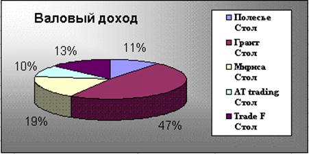| Диаграмма или нажмите кнопку Мастер диаграмм Метками строк и столбцов называются заголовки строк и столбцов. Если вы не включаете метки строк в область построения диаграммы, то на 4 шаге построения диаграммы нужно указать, что под метки строк отводится 0 строк. Метки столбцов являются текстом легенды. Легенда представляет собой прямоугольник, в котором указывается каким цветом или типом линий выводятся на графике или диаграмме данные из той или иной строки. XY-точечная диаграмма является наиболее подходящим типом диаграммы для обработки результатов лабораторных исследований. Линии тренда можно проводить на гистограммах, графиках, линейчатых и XY-точечных диаграммах. В Excel для отображения диаграмм можно использовать не только столбцы, линии и точки, но и произвольные рисунки. При построении графиков математических функций следует использовать в качестве типа диаграммы гладкие кривые. Excel поддерживает при построении графиков логарифмическую шкалу как для обычных типов графиков, так и для смешанных, то есть на одной оси вы можете ввести логарифмическую шкалу, а для другой — линейную. Рассмотрим построение диаграмм на примере данных приведенных в таблице 3 и 4. Любая диаграмма строиться на основании таблиц. Построим круговую диаграмму «Валового дохода». Круговая диаграмма строится на одном ряде данных, значения элементов ряда отображаются как сектора диаграммы (величина сектора зависит от величины элемента ряда). В нашем примере нужно построить круговую диаграмму по валовому доходу. Причем ряд данных должен содержать все цифры дохода за исключением общей суммы. Такая диаграмма будет заготовкой для отображения динамически изменяющейся диаграммы в зависимости от установленного на таблице фильтра. Процедура создания диаграммы следующая: ·