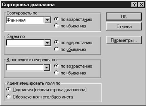 или убыванию проводится с помощью соответствующих кнопок При выборе Данные | Сортировка открывается окно диалога “Сортировка диапазона”, которое позволяет вам указать поля для сортировки и определить критерий сортировки. С помощью раскрывающегося списка Сортировать по вы можете выбрать столбец для сортировки. Порядок сортировки устанавливается переключателями по возрастанию или по убыванию. При сортировке по возрастанию текстовые данные упорядочиваются в алфавитном порядке от А к Я. Числовые данные упорядочиваются по возрастанию значений от минимального к максимальному. Даты упорядочиваются от наиболее ранней даты к наиболее поздней. При выборе переключателя по убыванию порядок сортировки изменяется на противоположный.