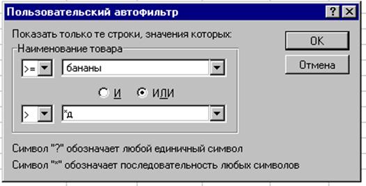 Рис. 31. Условия критерия При использовании сложных критериев следует применять команду Расширенный фильтр. Обе команды вызываются в результате выбора команды Данные | Фильтр. 5.6. Подведении итогов в базе данныхОдин из способов обработки и анализа базы данных состоит в подведении различных итогов. С помощью команды Данные | Итоги можно вставить строки итогов в список, осуществив суммирование данные нужным способом. При вставке строк итогов Excel автоматически помещает в конец списка данных строку общих итогов. После выполнения команды Данные | Итоги вы можете выполнить следующие операции: · выбрать одну или несколько групп для автоматического подведения итогов по этим группам · выбрать функцию для подведения итогов · выбрать данные, по которым нужно подвести итоги · Кроме подведения итогов по одному столбцу, автоматическое подведение итогов позволяет: · выводить одну строку итогов по нескольким столбцам · выводить многоуровневые, вложенные строки итогов по нескольким столбцам · выводить многоуровневые строки итогов с различными способами вычисления для каждой строки · скрывать или показывать детальные данные в этом списке Команда Итоги вставляет в базу данных новые строки, содержащие специальную функцию. Синтаксис: ПРОМЕЖУТОЧНЫЕ.ИТОГИ(номер_функции; ссылка) Номер_функции - это число от 1 до 11, которое указывает, какую функцию использовать при вычислении итогов внутри списка.