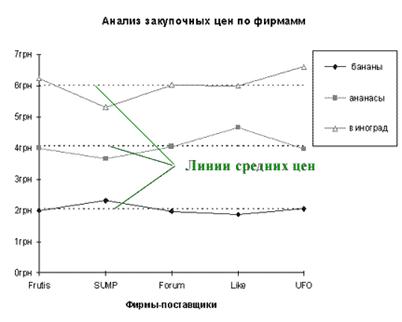 Обратите внимание: в таблице созданы поля средней стоимости, содержащие одинаковые значения. Так мы сможем построить горизонтальную прямую на графике. После этого, легко построить диаграмму анализа закупочных цен: