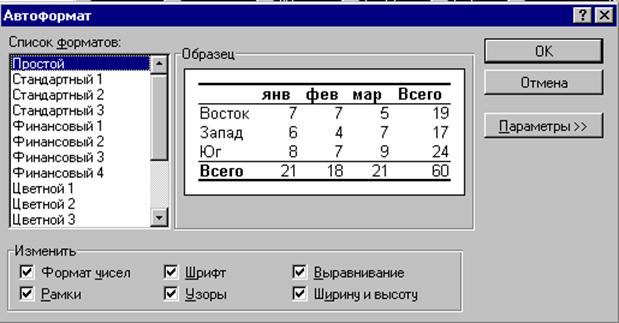 Рис. 33. Итоговая диаграмма Линии средних цен нужно отформатировать иначе, чем это делает мастер. Их нужно сделать того же цвета, что и линии закупочных цен, убрать маркеры и сделать пунктирными. 6. Некоторые специальные возможностиВ Excel существуют некоторые интересные возможности позволяющие упростить работу и несколько автоматизировать ее, ниже приведены некоторые из таких возможностей. 6.1. АвтоформатКоманда Формат | Автоформат... позволяет быстро оформить готовую таблицу воспользовавшись готовым Списком форматов.