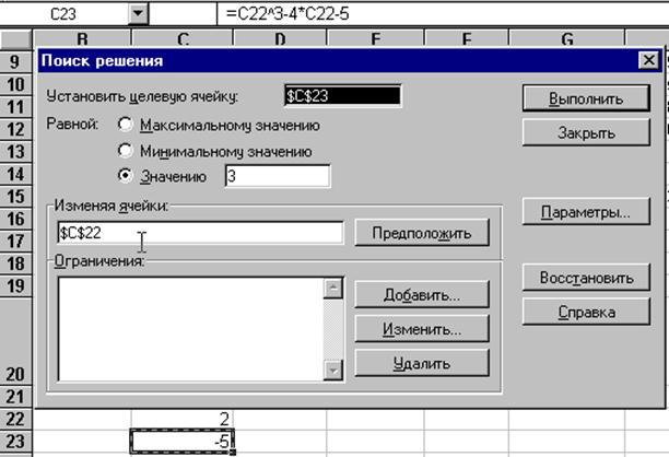Рис. 35. Решение уравнения в Excel 6.3. Создание сценариевЧасто встречается необходимость одним и тем же ячейкам присвоить разные значения, причем так, чтобы не потерять предыдущие значения. В Excel это выполняется за счет механизма сценариев, вызов которого производится через меню Сервис | Сценарии.... Откроется окно в котором будет список всех имеющихся сценариев (вначале этот список пуст). Нажмите кнопку "Добавить...", появится окно.