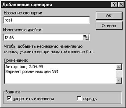 Рис. 36. Окно создания сценария В этом окне надо: 1. Дать имя сценарию; 2. Указать те ячейки, которые будут изменяться данным сценарием. 3. Написать комментарии к данному сценарию в поле Примечание 4. Нажать кнопку ОК