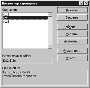 Рис. 37. Диспетчер сценариев После этого появится новое окно, где нужно ввести значения для указанных ячеек. Описанную операцию нужно повторить несколько раз для создания нескольких. Для того, чтобы заполнить ячейки значениями из конкретного сценария, нужно выбрать его в списке и нажать кнопку Вывести. 6.4. Отчет по сценариям.После того, как сценарии созданы, можно создать отчет по этим сценариям. Для этого используется кнопка Отчет... В окне Отчет по сценарию укажите: Тип отчета | Структура, а в поле Ячейки результата - укажите адреса ячеек (разделенные знаком "точка с запятой") в которых содержатся итоги (например: I13;I19;I25;I31;I38). После этого будет автоматически создана новая страница с отчетом по исходным данным сценариев и ячейкам результатов. 6.5. Создание макросаМакрос - это запись определенной последовательности действий в Excel. Такая запись выполняется на языке Visual Basic (или на языке макрокоманд для ранних версий) на специальных листах рабочей книги "Модуль#", которые являются редакторами этого языка. Каждая такая запись должна иметь собственное имя. С точки зрения программирования – это подпрограмма. Sub