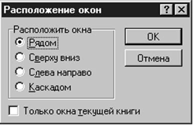 Команда Упорядочить все (меню Окно) Отображает все открытые документы в окнах так, чтобы они не перекрывались на экране. Данный режим используется для того, чтобы отобразить окна, которые не видны, или чтобы организовать размещение окон на экране. Окна Активной Рабочей Книги, если этот флажок установлен, то команда Упорядочить упорядочивает только окна активной рабочей книги. Если флажок не установлен, то команда Упорядочить упорядочивает все не скрытые окна.