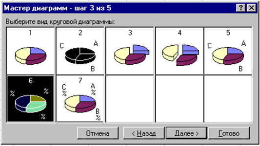 Рис. 23. Подтипы Круговой диаграммы · Затем устанавливаются параметры, определяющие: какая часть диапазона будет отображена как данные, а какая - как метки сегментов и названия. Порядок построения диаграмм в разных версиях Excel немного отличается (смысл остается тот же, диалоги разные) Excel 7.0/95· На последующих шагах выбирается круговой тип диаграммы и ее подтип · Затем устанавливаются параметры, определяющие: какая часть диапазона будет отображена как данные, а какая - как метки сегментов и названия.