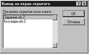 Рис. 11. Команды Скрыть и Показать Скрывают окно активной рабочей книги или показывают скрытое ранее окно. Окно, которое будет показано выбирается из списка скрытых окон. Хотя скрытое окно и не видно, оно по прежнему открыто. Можно скрыть рабочую книгу, которая должна быть открыта, но не обязана быть видимой. Если окно рабочей книги защищено паролем, то пароль будет запрошен и при скрытии окна. Дополнения не могут быть сделаны видимыми при помощи команды Показать. Если все окна скрыты, то команда Показать перемещается из меню Окно в меню Файл. Команды Разбить и Удалить Разбиение (меню Окно)