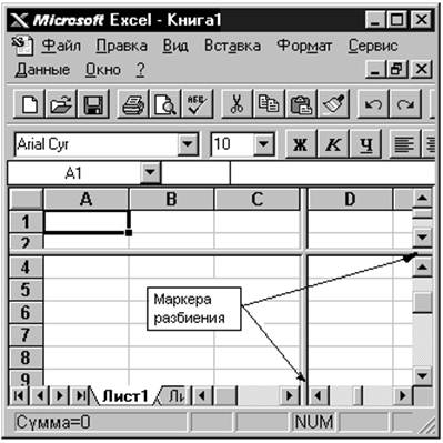 Рис. 12. Разбиение окна Команда Разбить разбивает активное окно на два или четыре подокна. Эта команда позволяет прокручивать подокна одновременно. Два горизонтальных подокна всегда будут иметь одинаковые заголовки столбцов; два вертикальных подокна всегда будут иметь одинаковые заголовки строк. Используйте команду Фиксировать Подокна для отмены прокрутки в верхнем, левом или обоих подокнах разбиения. Команда Удалить Разбиение удаляет разбиение в активном окне. Эта команда доступна только тогда, когда активное окно разбито. Двойной щелчок на маркере разбиения или на линии разделения также удаляет разбиение. Команда Фиксировать Подокна фиксирует верхнее подокно, левое подокно или оба подокна на активном рабочем листе. Эта команда нужна для того, чтобы сохранить заголовки строк или столбцов на экране, если на рабочем листе прокручиваются длинные списки. Эта команда запрещает подокнам слева от вертикального разбиения прокручиваться горизонтально, а подокнам над горизонтальным разбиением — прокручиваться вертикально. Можно также использовать кнопку Фиксация Подокон для фиксации или отмены фиксации подокон на рабочем листе. Если окно не разделено на подокна, то эта команда разделит окно по активной ячейке. Примечание: Фиксация заголовков на рабочем листе не влияет на печать. Команда Отменить Фиксацию отменяет фиксацию подокон на рабочем листе. Также можно повторно щелкнуть по кнопке Фиксация Подокон для отмены фиксации. Эта команда появляется в меню Окно только в том случае, если фиксация уже введена при помощи команды Фиксировать Подокна. Команды 1, 2, 3, ...9 (меню Окно) Перечисляет текущие открытые окна в низу меню Окно. Выбор номера окна переключает на него. Отметка располагается перед активным окном. Если открыто более, чем девять окон, то в конце списка появляется команда Другие Окна. Выберите ее для просмотра списка всех открытых окон. 2.4. Ввод и редактирование данныхДля ввода информации в заданную ячейку нужно установить на нее курсор или нажать мышью на этой ячейке. После этого можно начинать вводить данные. С вводом первого символа вы переходите в режим ввода, при этом в строке состояния отображается слово Ввод. Если информация уже введена в ячейку и нужно лишь добавить или скорректировать ранее введенные данные, дважды нажмите мышью на нужной ячейке или нажмите клавишу F2, когда требуемая ячейка выделена. При этом вы переходите в режим ввода и можете внести необходимые изменения в данные, которые находятся в этой ячейке. Вы можете восстановить содержимое ячейки не выходя из режима ввода. Для этого нужно нажать CTRL+Z или ESC. Восстановление данных и выход из режима ввода осуществляется нажатием мышью на красном крестике, расположенном в строке ввода. Строка ввода. Поле имени находится в левом конце строки ввода. Используйте поле имени для задания имен активной ячейке или выделенному блоку. Для этого щелкните на поле имени, введите туда имя и нажмите ENTER. Такие имена можно использовать при написании формул или при построении диаграмм. Также поле имени можно использовать для перехода к поименованной ячейке или блоку. Для этого откройте список и выберите из него нужное имя. В Таблице 1 показано пример создания таблицы для расчета валового дохода. Таблица 1
