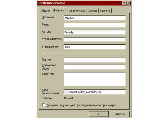 Чтобы в документе Word можно было использовать относительные гиперссылки, необходимо установить базовый адрес гиперссылок: 1. Открыть документ, для которого необходимо установить базовый адрес гиперссылок. 2. Выбрать команду Файл, Свойства. 3. Раскрыть вкладку Документ. 4. В поле База гиперссылки ввести путь, относительно которого будут отсчитываться все гиперссылки в документе.