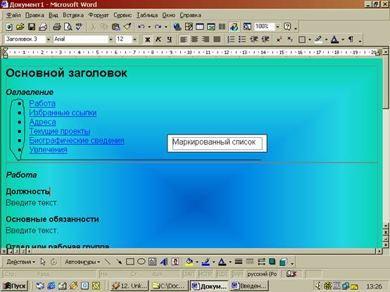 Форматирование символов текстаПри создании Web-страниц в Word используются те же средства форматирования текста, что и для документов Word. Например, можно присвоить тексту полужирное начертание с помощью кнопки полужирный и т.д. При создании страницы требуется только отформатировать текст надлежащим образом, т.к. исходный код Web-страницы обрабатывается в неявном виде. Тип шрифта также может быть изменен, однако нужно учитывать, что другие пользователи Web-страниц могут не иметь таких шрифтов. По этой причине в некоторых программах просмотра текст будет изображаться только шрифтами, используемыми по умолчанию. Создание маркированных и нумерованных списков Так же как и в стандартных документах Word, в Web-страницах можно создавать маркированные и нумерованные списки. Для изменения графического маркера можно воспользоваться командой Формат, Список. Чтобы создать маркированный список: 1. Выделить абзац, который должен быть отформатирован как маркированный список. 2. Выбрать команду Формат, Список. 3. В появившемся диалоговом окне Список раскрыть вкладку Маркированный. 4. Выделить тип маркера и нажать кнопку ОК. или нажать кнопку Изменить для просмотра всего списка возможных графических маркеров. Выбрать подходящее изображение и нажать кнопку ОК, чтобы вернуться в документ. Можно также воспользоваться кнопкой Маркированный список панели инструментов Форматирование. Чтобы создать на Web-странице нумерованный список или изменить его формат: 1. Выделить абзацы, которые должны быть отформатированы как нумерованный список. 2. Выбрать команду Формат, Список. 3. В появившемся диалоговом окне Список раскрыть вкладку Нумерованный. 4. Выделить требуемый тип нумерации и нажать кнопку ОК. Можно также воспользоваться кнопкой Нумерованный список панели инструментов Форматирование.