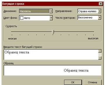 4. Заполнить поле Ввести текст бегущей строки. 5. Настроить скорость, цвет, параметры движения и повтора бегущей строки. 6. Нажать кнопку ОК. Чтобы изменить параметры бегущей строки после того, как она уже добавлена на Web-страницу, надо выделить бегущую строку и нажать кнопку Бегущая строка панели инструментов Веб-компоненты.