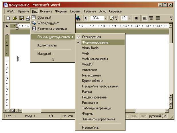 Элементы окна, специфичные для процессора Word. 1. На горизонтальной линейке «укреплены» треугольники. Верхний треугольник (слева) предназначен для установки отступа в первой (красной) строке абзаца, а нижние треугольники (слева и справа), применяется для установки отступов абзаца от границ страницы (т.е. левой и правой границ абзаца). Эти отступы можно установить. Передвигая треугольники вдоль линейки. С помощью нижних треугольников можно переместить разделители столбцов таблицы. На линейках имеются деления, светлые участки линейки- это ширина и высота области текста на странице, а серые участки слева, справа. Сверху и снизу- это поля страницы. 2. В левой части горизонтальной полосы прокрутки находятся три кнопки выбора режима отображения- Обычный, Разметка страницы и Структура. 3. Строка состояния. Среди полей, расположенных в правой части строки, находится ЗАМ (замена, в английской версии OVR). Если название этого переключателя имеет белый цвет, то в Word установлен режим вставки символов; если цвет черный, то Word работает в режиме замещения символов. Переключение между режимами- стандартное (клавишей {Ins} или двойным щелчком мыши на поле ЗАМ). Панели инструментовВ Word имеется несколько встроенных панелей инструментов; кроме того можно создавать собственные, специальные панели. Работая с MS Word используются в основном три панели инструментов: панель «Стандартная», панель «Форматирования» и панель «Обрамления». С помощью флажков диалогового окна команды [Вид-Панели инструментов…] можно выдавать или не выдавать ту или иную панель инструментов на экран. Подцепив панель инструментов мышью в области свободной от кнопок, можно переместить ее. Если панель инструментов не помещается на экране целиком, то в ее правом верхнем углу появляется двойная стрелка, нажав на которую можно получить доступ к оставшимся кнопкам. С помощью значка со стрелкой вниз в правой части панели инструментов или в заголовке панели инструментов можно быстро скрыть или отобразить нужную кнопку на панели инструментов. Для это надо нажать на значок со стрелкой вниз, подвести указатель мыши к команде [добавит или удалить кнопки] и установить или сбросить соответствующий флажок в списке. Панель инструментов Веб-узел- используется для управления