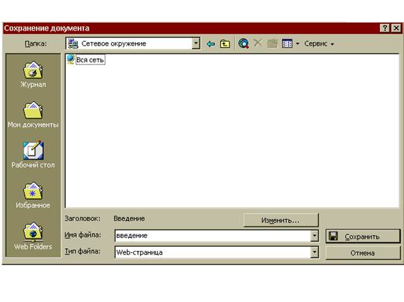 Explorer или какой-либо другой программы просмотра. Работа с гиперссылками В современном мире информационных технологий одной из самых важных задач является обеспечение удобного и быстрого доступа к информации. Очень часто оказывается, что доступ потенциальных читателей (которые могут быть, например, коллеги или же массовая аудитория) к документу затруднен или вообще невозможен. С давних времен возможности публикации документов сильно продвинулись вперед. Сегодня в большинстве случаев не нужно заботиться о публикации бумажной версии документа, хотя сложно представить себе издание сочинений Пушкина в форме, отличной от привычной всем книжной. Однако огромная масса документов обладает одним или всеми перечисленными ниже важными свойствами: -могут подлежать дополнительной обработке и изменению; -содержать информацию, по которой необходимо проводить поиск; -они изначально предназначены для использования в электронном варианте. Для публикации таких документов и предназначены хорошо известные большинству людей сети Интернет. Использование технологий Интернета при публикации документов упрощает доступ потенциальных читателей к информации, которую нужно до них донести. ИнтернетЭто сеть, в которой информация легко доступна, даже при использовании различных типов компьютеров с различными возможностями. Вместо применения архаических команд работы с сетями, можно просматривать страницы информации, просто вводя адрес страницы. Этот адрес известен как унифицированный указатель ресурсов. Web-страница Это текстовый документ, содержащий специальные команды. При открытии Web-страницы в простом текстовом редакторе будут отображаться именно эти команды и больше ничего. Однако будучи открытой с помощью программы просмотра Интернета, такой как Internet Explorer, Opera или Netscape Navigator, Web-страница может отображать текст, графику, гиперссылки на другие документы, а также элементы управления. Секрет состоит в том что программа просмотра Web-страниц содержит интерпретатор команд языка HTML, содержащихся в файле Web-страницы. Язык HTML Этот язык является системой разметки документов для их дальнейшей публикации в сети World Wide Web. Документы, подготовленные в формате HTML, включают рисунки со ссылками и команды форматирования. Для просмотра этих документов используется средство просмотра Web-страниц. ГиперссылкаЭто текст или графическое изображение, при щелчке по которому осуществляется переход к файлу, определенному месту в файле, странице HTML в World Wide Web или странице HTML во внутренней сети. При переходе между страницами с помощью гиперссылок создается и сохраняется хронология просмотра всех страниц. Основная частьСохранение документа в формате HTML Чтобы сохранить документ в формате HTML: 1. открыть документ и выбрать команду Файл, Сохранить как. Появится диалоговое окно Сохранение документа.