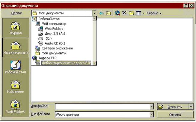 2. Указать папку, в которой нужно сохранить документ. Это может быть папка на локальном или сетевом диске или же папка, размещенная на Web-сервере или сервере FTP. 3. Ввести имя документа в поле Имя файла. 4. В раскрывающемся списке Тип файла выделить элемент Веб страница. В диалоговом окне Сохранение документа появится кнопка Изменить, с помощью которой можно указать текст, который должен отображаться в заголовке программы просмотра при открытии сохраняемого документа. Текущий текст заголовка выводится слева от кнопки Изменить. 5. Нажать кнопку Изменить, чтобы изменить текст заголовка. Появится диалоговое окно Задание заголовка страницы. 6. Ввести текст заголовка и нажать кнопку ОК. 7. Нажать кнопку Сохранить. Документ будет сохранен в формате HTML. Доступ к документам на сервере FTP Word позволяет открывать и сохранять документы в файловых архивах на серверах FTP. Для этого необходимо, чтобы адрес данного сервера был зарегистрирован. Для регистрации адреса FTP: 1. Выбрать команду Файл, Открыть или Файл, Сохранить как. 2. Раскрыть список Папка и выделить элемент Добавить/изменить адреса FTP, как показано на