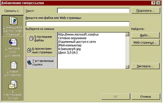 4. В поле Текст ввести текст, который должна отображать гиперссылка. 5. В поле Адрес ввести путь или URL для файла, на который должна указывать гиперссылка. Гиперссылка может указывать на файл, находящийся на локальном диске или в сети, на фрагмент документа Office, на еще не существующую страницу, а также на адрес электронной почты. 6. Нажать кнопку ОК. гиперссылка будет вставлена в документ. Чтобы выбрать тип объекта, на который должна указывать гиперссылка, надо использовать панели из группы Связать с. Например, чтобы создать гиперссылку на фрагмент текущего документа Word, надо щелкнуть по ярлыку местом в документе и в появившемся иерархическом списке выделить нужный документ.