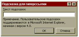Поиск файла на локальном диске: 1. Нажать кнопку Поиск файла. 2. В открывшемся диалоговом окне Связать файлы указать нужный файл. 3. Нажать кнопку ОК. Для поиска Web-страницы, на которую должна указывать гиперссылка: 1. Нажать кнопку Интернет. Запустится программа Internet Explorer. 2. Открыть в Internet Explorer интересующий документ. 3. Закрыть окно Internet Explorer. Адрес документа будет автоматически введен в поле Адрес. Чтобы при наведении мыши на гиперссылку автоматически отображалась всплывающая подсказка с пояснительным текстом: 1. Нажать кнопку Подсказка. 2. В открывшемся диалоговом окне Подсказка для гиперссылки ввести текст подсказки.