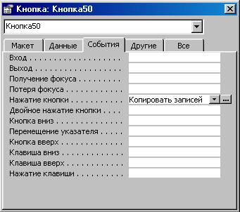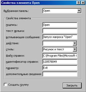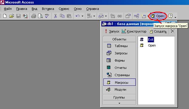 Рис 19. Свойство кнопки “Open” · Введите желаемый текст в поле Всплывающая подсказка. На созданной вами панели инструментов можно разместить любые другие полезные кнопки, не только кнопки для запуска макросов. Когда создание панели инструментов закончено, вы можете переместить ее на свободное место в верхней части экрана (или поместить у любой другой границы экрана). Если нужно создать панель инструментов для вызова нескольких макросов, мы рекомендуем объединить эти макросы в одну группу (создание группы макросов было описано в предыдущем разделе). Создание такой панели инструментов можно осуществить с помощью одной команды Сервис, Макрос, Создать панель инструментов из макроса. Попробуйте сделать это для одной из групп макросов в базе данных «db1», например, «Open». С помощью указанной команды создается панель инструментов с кнопками для вызова каждого макроса из группы, причем на кнопках отображаются имена соответствующих макросов. Новая панель инструментов получает такое же имя, как имя группы макросов. При желании можно заменить текст на кнопках значками, как это было описано выше. 2.7. Связывание макросов с событиями. В базе данных хранится информация о состоянии её объектов. Любое изменение состояния формы или отчета называется событием. Каждый из этих объектов имеет свой набор событий. С событиями удобно связывать макросы. Попробуем связать созданный нами макрос Сообщение с открытием базы данных: · Маркируйте макрос Размещение на экране в окне базы данных. · Выберите в меню Павка команду Переименовать и присвойте макросу Сообщение новое имя AutoExec (макрос с таким именем автоматически выполняется при загрузке базы данных). Вы можете произвольным образом использовать строчные и прописные литеры. Теперь макрос связан с открытием базы данных. Таким образом автоматизируются операции, которые должны всегда выполняться в момент загрузки базы. При каждом открытии базы данных Accesss 2000 поверяет присутствует ли макрос с именем AutoExec, и, если находит, выполняет его. В противном случае открытие базы не сопровождается дополнительными действиями. Внутри одной базы данных может использоваться только один макрос AutoExec. · Чтобы проверить работоспособность макроса, закройте, а затем откройте базу данных. Если имя AutoExec присвоено макрогруппе, то при открытии базы данных будет выполнен только первый макрос этой группы! Чтобы при загрузке базы последовательно приводились в исполнение несколько макросов, введите в макрос AutoExec макрокоманду ЗапускМакроса, что позволит выполнить макрос с произвольным именем (имя задается аргументом) и вернуться к следующей за ЗапускМакроса макрокоманде в макросе AutoExec. Макрос AutoExec не выполняется, если перед открытием базы данных нажать и удерживать клавишу [Shift]. 2.8. Связывание макроса с кнопкой Целесообразно создавать элементы управления (например, кнопки) для вызова макросов. Это значительно упрощает и ускоряет доступ к ним. Удобным местом для размещения таких элементов является заголовок или примечание формы. В качестве упражнения попробуем связать с кнопкой макрос, который маркирует активную запись формы и копирует ее в буфер обмена: · Создайте макрос Копировать, состоящий из следующих макрокоманд: · Макрокоманда Аргумент ВыполнитьКоманду Select Record ВыполнитьКоманду Copy · Сохраните макрос и закройте ег
