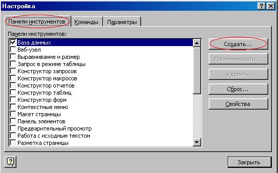 Рис 12. Диалоговое окно “Настройка” с вкладкой “Панель Инструментов”, кнопка “Создать” · В появившемся диалоговом окне введите имя новой панели инструментов мои макросы и нажмите кнопку ОК. Появится пустая панель инструментов.