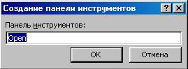 Рис 13. Ввод имени новой Панели Инструментов · Выберите вкладку Команды. · Выберите в списке Категории значение Все макросы, а в списке Команды найдите макрос «Open». · Перетащите этот макрос с помощью мыши на пустую панель инструментов.