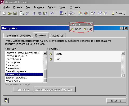 просто нажать на кнопку Запуск Если вы часто используете этот способ запуска макроса, имеет смысл застроить панель инструментов, добавив на нее стандартную кнопку Запуск макроса. Она эквивалентна выполнению команды меню. 2.4. Запуск макроса из окна базы данныхЧтобы запустить макрос из окна База данных щелкните по ярлыку Макросы на панели объектов, найдите в списке нужный макрос и дважды щелкните по нему кнопкой мыши или нажмите кнопку Запуск на панели инструментов окна базы данных. Последний способ подходит, только если в выбранном объекте содержится один макрос. В противном случае нужно воспользоваться универсальным способом выполнения макроса, описанным выше. 2.5. Запуск макроса с помощью кнопки на панели инструментов Прямые способы запуска макросов являются простыми, но не самыми быстрыми. Существуют более удобные и быстрые способы. Наиболее удобный с нашей точки зрения способ запуска макроса — это создание специальной кнопки на панели инструментов. Правда, панелей инструментов очень много, причем в разных режимах работы с Access на экране появляются разные панели. Поэтому наиболее разумным является создание специальной панели инструментов, на которую вы можете поместить все нужные кнопки. Тем не менее, операция добавления специальной кнопки на стандартную панель инструментов чрезвычайно проста. Чтобы добавить кнопку на стандартную панель инструментов Access: · Щелкните правой кнопкой мыши по панели инструментов и выберите в контекстном меню команду Настройка. · В появившемся диалоговом окне Настройка раскройте вкладку Панели инструментов. · Установите флажок для одной из стандартных панелей инструментов, например, Запрос в режиме таблицы, чтобы она отобразилась на экране. · Щелкните по ярлыку Макросы на панели объектов в окне База данных и найдите нужный макрос. · Перетащите макрос с помощью мыши на панель инструментов 2.6. Запрос в режиме таблицы. На панели инструментов появится кнопка с характерным значком макроса. Если вы подержите несколько секунд курсор на этой кнопке, то увидите подсказку Запуск макроса <имя макроса>. Вы можете таким образом переместить на панель инструментов созданный нами макрос «Open». Теперь всякий раз, когда эта панель инструментов будет отображаться на экране, вам будет доступна кнопка запуска этого макроса.