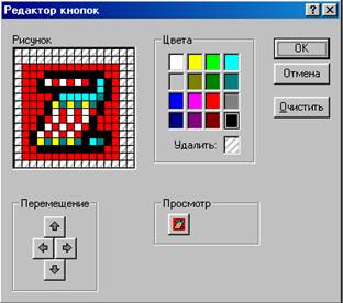 Рис 16. Редактор кнопок Наконец, можно просто скопировать понравившийся вам значок с другой кнопки. Чтобы скопировать значок с одной кнопки на другую: · Откройте диалоговое окно Настройка и выделите ту кнопку на панели инструментов, с которой нужно скопировать значок. · Нажмите кнопку Изменить выделенный объект в диалоговом окне Настройка. · Выберите в контекстном меню команду Копировать значок на кнопке. · Выделите кнопку, значок которой нужно изменить.