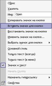 Рис 15. Контекстное меню только что созданной кнопки Видим, что данный режим отображения кнопки помечен, как Основной стиль. Вообще говоря, на кнопке можно поместить не только значок, но и текст или текст и значок вместе. Если вы хотите поместить на кнопке текст (название кнопки), введите этот текст в поле Имя. По умолчанию в этом поле отображается имя макроса. Вы можете поместить на кнопку другой значок, выбрав понравившуюся картинку на специальной панели. Для отображения набора стандартных значков выберите в контекстном меню команду Выбрать значок для кнопки. Если же ни одна из картинок не подходит, можно выбрать наиболее близкий по оформлению значок, а потом исправить его в специальном редакторе. Чтобы открыть окно Редактор кнопок выберите в контекстном меню команду Изменить значок на кнопке.