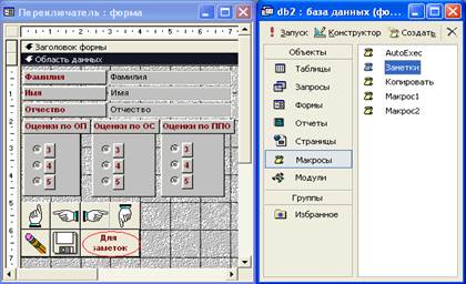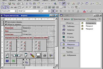 Рис 25. Режим конструктора формы “Переключатель” · Активизируйте режим формы и щелкните мышью на кнопке Заметки. После запуска этого макроса (щелчком на кнопке Заметки в форме Переключатель) на экране появится окно текстового редактора Word 2000 пакета Microsoft Office 2000. Теперь пользователь может ввести свои заметки, распечатать или сохранить их.