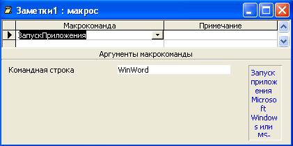 Рис 28. Режим Конструктора для макроса “Заметки” · Присвойте аргументу Командная строка значение WinWord Заметки и сохраните макрос.
