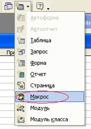 Рис. 1. Кнопка для создания макроса 2. Щелкните по стрелке вниз на кнопке Новый объект на панели инструментов База данных и выберите элемент Макрос. Рис. 2. Новый объект на панели инструментов База данных Окно Конструктора построено аналогично Конструктору таблиц, т. е. разделено по горизонтали на две части — панель описаний и панель аргументов.
