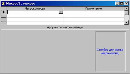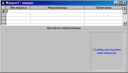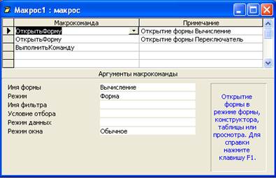 Рис. 3. Конструктор макросов и панель аргументов Верхняя часть окна Конструктора — панель описаний — состоит из нескольких столбцов. По умолчанию на этой панели выводится два столбца: Макрокоманда и Примечание. Панель описаний позволяет определить последовательность макрокоманд, из которых состоит макрос. Строка в столбце Макрокоманда представляет собой поле со списком, в котором можно выбрать нужную макрокоманду. Строка в столбце Примечание — это обычное текстовое поле, в которое можно ввести комментарий, описывающий выполняемое действие. Когда поле Макрокоманда заполнено, в нижней части окна Конструктора макроса появляется панель аргументов, которая служит для ввода значений аргументов соответствующей макрокоманды. Список полей на этой панели зависит от выбранной макрокоманды и может отсутствовать, если макрокоманда не имеет аргументов. Таким образом, при создании макросов не нужно запоминать список аргументов для каждой макрокоманды. На панели аргументов имеются два поля, которые позволяют задать имя фильтра и условие отбора записей. Для того чтобы задать условие отбора записей, можно воспользоваться построителем выражений. Такой макрос можно использовать в форме или отчете для того, чтобы ограничить число отображаемых записей. Существует еще один очень простой способ ввода макрокоманды. Допустим, нужно создать макрос, который должен открывать форму “Вычисление” в приложении “db1”. Для этого в окне База данных нужно щелкнуть по Форме, затем, используя панель инструментов (способ 2), открыть Конструктор макросов и перетащить с помощью мыши Форму “Вычисление” в поле Макрокоманда окна Конструктора макроса. Тогда в поле Макрокоманда автоматически появится макрокоманда ОткрытьФорму, а на панель аргументов автоматически заполняются поля: в поле Имя формы появляется имя формы “Вычисление”, в поле Режим – значение по умолчанию Форма, в поле Режим окна – значение Обычное. Остальные поля останется пустыми. Кроме того, можно сделать записи в этой форме недоступными для изменений, для этого в поле Режим данных нужно ввести значение Только чтение.