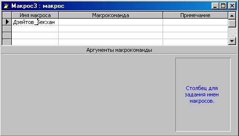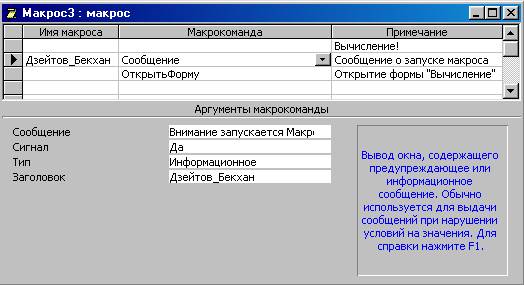 Реферат: Использование макросов в MS Access 2000Реферат: Использование макросов в MS Access 2000Задание Использование макросов в базе данных Microsoft Access Исследовать возможности Access по созданию макросов 1. Введение Использование макросов в базе данных Microsoft Access С помощью макросов можно выполнить практически все действия над объектами Access. Существенной особенностью Access по сравнению с такими компонентами Microsoft Office, как Word и Excel, является возможность с помощью макросов и модулей VBA Определять реакцию приложения на различные события в формах и отчетах, такие как нажатие кнопок, изменения данных, открытие и закрытие форм и отчетов, получение формой или элементом управления формы фокуса и т. д. Макрос в Access представляет собой структуру, состоящую из одной или нескольких макрокоманд, которые выполняются либо последовательно, либо в порядке, заданном определенными условиями. Набор макрокоманд в Access очень широк, с помощью макросов можно реализовать многое из того, что позволяют сделать процедура на VBA. Каждая макрокоманда имеет определенное имя и, возможно, один или несколько аргументов, которые задаются пользователем. Например, при использовании макрокоманды ОткрытьФорму в качестве аргументов необходимо задать, по крайней мере, имя открываемой формы и режим вывода ее на экран. В Microsoft Access 2000 содержится список макрокоманд, сгруппированных по категориям: работа с данными в формах и отчетах; выполнение команд, макросов, процедур и запросов; работа с объектами; импорт/экспорт данных и объектов и прочие. В категорию ” ” собранны все макрокоманды, которые позволяют влиять на интерфейс приложения. Действия, которые могут быть выполнены с помощью макросов, очень разнообразны. Даже если вы не будете использовать макросы в своих приложениях, имеет смысл изучить эти макрокоманды, поскольку их можно использовать и в процедурах VBA. Использование макросов оправдано тем, что их легко создавать, и для этого не нужно изучать синтаксис языка программирования. Как будет показано в следующем разделе, для создания макроса требуется знать лишь основные приемы работы в Microsoft Access и Windows, такие как перетаскивание объектов из окна База данных в специальное окно – Конструктор макросов, выбор действия из списка и ввод выражений в качестве аргументов макрокоманды. Поэтому, если очень не хочется изучать синтаксис языка VBA или это представляется слишком трудным, смело применяйте макросы, и вы получите приложение с достаточно большими функциональными возможностями. Основное назначение макросов — это создание удобного интерфейса приложения: чтобы формы и отчеты открывались при нажатии кнопок в форме или на панели инструментов или же привычным выбором команды меню; чтобы при открытии приложения пользователь видел на экране не окно База данных, наполненное множеством таблиц, запросов, форм и отчетов, а некую понятную форму, с помощью которой можно было бы сразу производить желаемые действия и т. д. С помощью макросов можно создать удобные меню и панели инструментов для приложения. Однако использование макросов имеет и некоторые недостатки: - Возможности макрокоманд ограничены по сравнению с возможностями языка VBA, поэтому в ряде случаев без программирования на VBA не обойтись, хотя сначала нужно быть уверенным, что эти дополнительные возможности действительно нужны. Яз