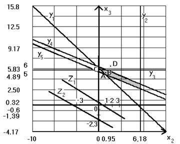 Мы получили, что график функции Z2 расположен ниже чем график функции Z1. Однако Z2 > Z1 (9000 > 8000). Следовательно своего максимального значения целевая функция достигает в самой нижней точке области относительно целевой функции (в той точке, через которую график целевой функции будет проходить первым при уменьшении целевой функции). Обозначим эту точку на графике A. Координаты точки A (0,95;4,89). x2 = 0,95; x3 = 4,89, что соответствует решению с помощью симплекс – метода. 2. Задача ЦЛП. Максимального значения целевая функция задачи ЦЛП достигает при x2 = 1, x3 = 5. На графике решение задачи ЦЛП – точка B с координатами (1;5). 3. Задача нелинейного программирования. x2 = 0,17, x3 = 5,66. На графике точка C с координатами (0,17;5,66). 4. Задача ДП.