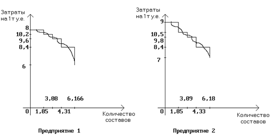 Аппроксимация кривой зависимости затрат от количества составов. Примеры графиков для предприятий 1 и 2.