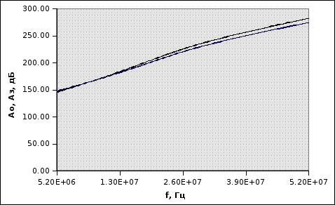 Рис. 9.1 Частотная зависимость переходного затухания на ближнем конце Ао и защищенности на дальнем конце Аз на длине регенерационного участка. В таблицу 1 сведены все рассчитанные параметры передачи и взаимного влияния цепей коаксиального кабеля.