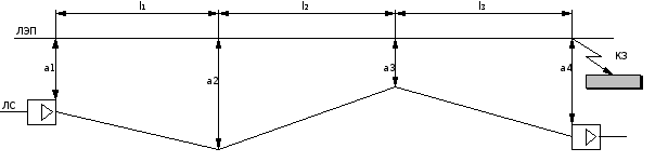 В процессе проектирования КМ часто возникает необходимость априорной оценки возможности установки той или иной аппаратуры ЦСП по известным статистическим параметрам взаимных влияний. В табл. 6.4 [1] приведены требуемые минимальные значения переходных затуханий на дальнем конце РУ и между цепями на частоте 250 кГц. Как видно из сопоставления данных в таблице требуемых значений переходных затуханий с рассчитанными, все цепи рассчитываемого кабеля можно оборудовать аппаратурой ИКМ-480ґ2, так как требования к защищенности цепей кабеля выполняются. Расчет опасного магнитного влияния ЛЭП на симметричные цепи кабеля.На работу кабельных линий связи оказывает влияние ряд посторонних источников: линии электропередачи (ЛЭП). Контактные сети электрифицированных железных дорог, атмосферное электричество (удары молний), передающие радиостанции. Указанные источники создают в цепях кабельных линий опасные и мешающие влияния. Необходимо оценить то опасное влияние, которое создает ЛЭП на симметричные цепи, находящиеся в сердечнике бронированного кабеля. Рассматриваемая ЛЭП представляет собой трехфазную линию передачи с заземленной нейтралью. Она работает на переменном токе с частотой f=50 Гц. Опасное влияние возникает при нарушении нормального режима работы ЛЭП, например при заземлении провода одной из фаз в точке на конце регенерационного участка. В этом случае в ЛЭП возникает ток короткого замыкания I, достигающий больших значений и оказывающий на линию связи опасное магнитное влияние. Трасса сближения, показанная на рис. 10.1 состоит из трех участков, длиной l1=6 км; l2=7 км; l3=7 км; и шириной сближения между ЛЭП и ЛС a1=100 м; а2=130 м; а3=90 м. Продольная ЭДС, индуцируемая в симметричных цепях кабеля связи определяется по формуле, в В