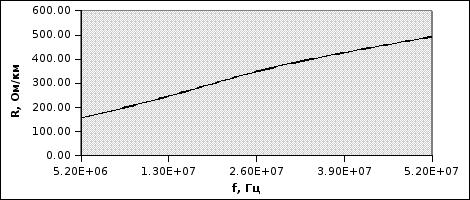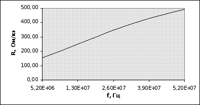 Результаты расчетов параметров передачи поместим в таблицу 1.По результатам расчетов построим графики частотной зависимости параметров передачи коаксиальных пар из меди. На рис. 7.1 показана частотная зависимость активного сопротивления коаксиальной цепи. Из рисунка видно, что с ростом частоты активное сопротивление закономерно возрастает за счет поверхностного эффекта и эффекта близости. Причем наибольшее удельное значение имеет сопротивление внутреннего проводника.